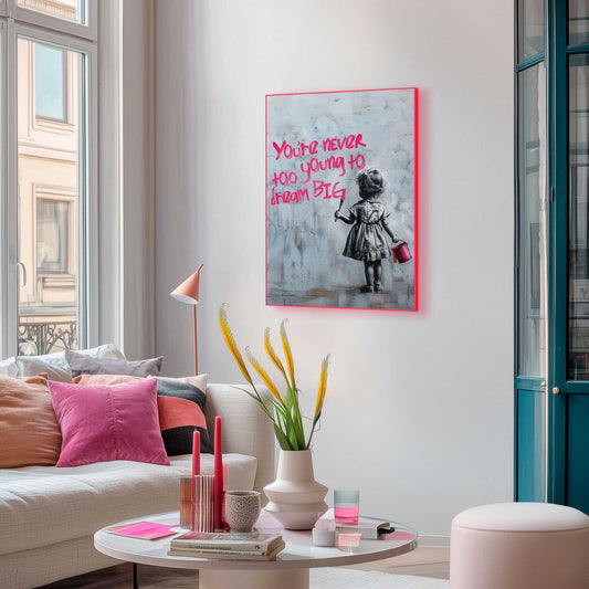 Framed Poster Never Too Young in Neon 70x50