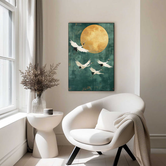 Circle Art Cranes flying by the moon 50x50