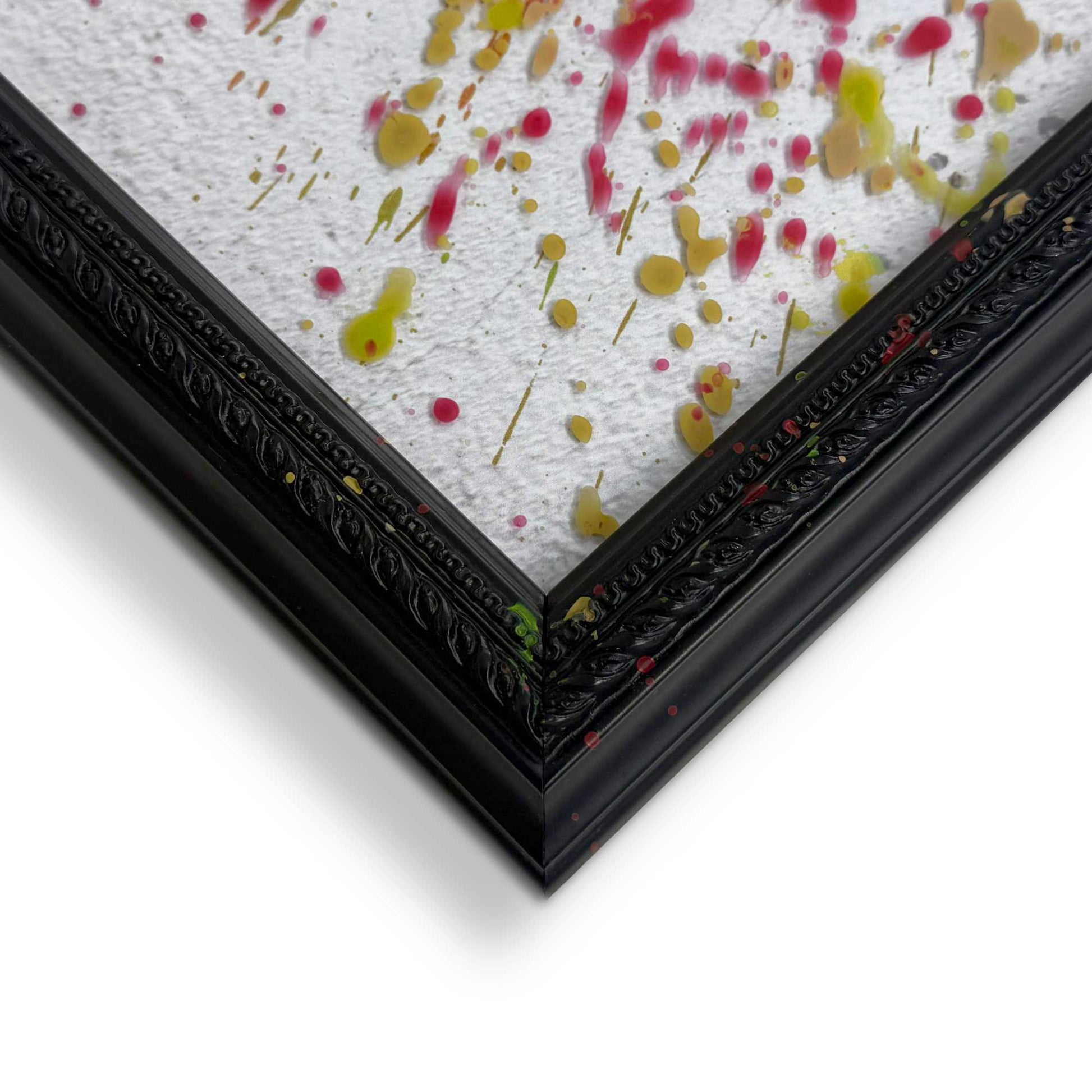 Both the acrylic glass and the decorative frame are painted as part of the design, allowing the artwork to extend beyond the print itself. This layered construction adds depth, texture and a subtle glossy effect, enhancing the richness of the design. An integrated hanging system on the back ensures the artwork is easy to hang and ready to display.